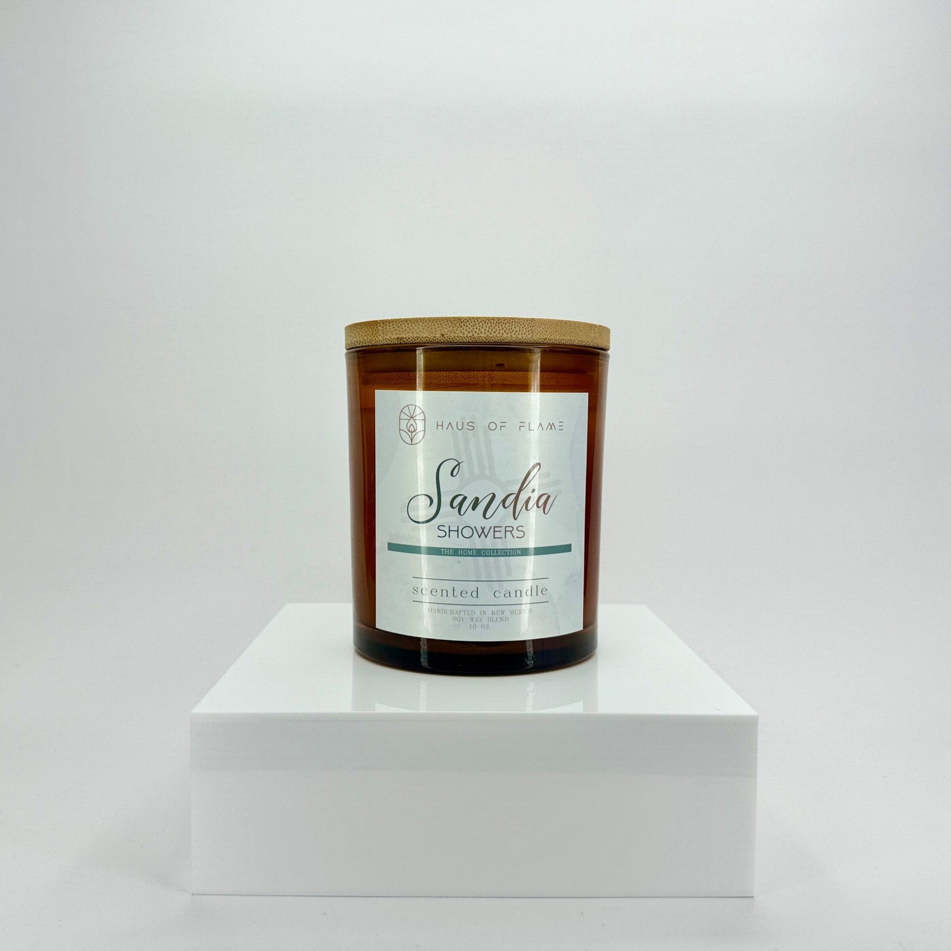 Revel in the refreshing essence of rain cascading down the Sandia Mountains with the Sandia Showers candle from Haus of Flame Candle Co. This elegant scent layers fresh rain and mossy wood with delicate lavender and rose, evoking the renewal of nature after a mountain storm.